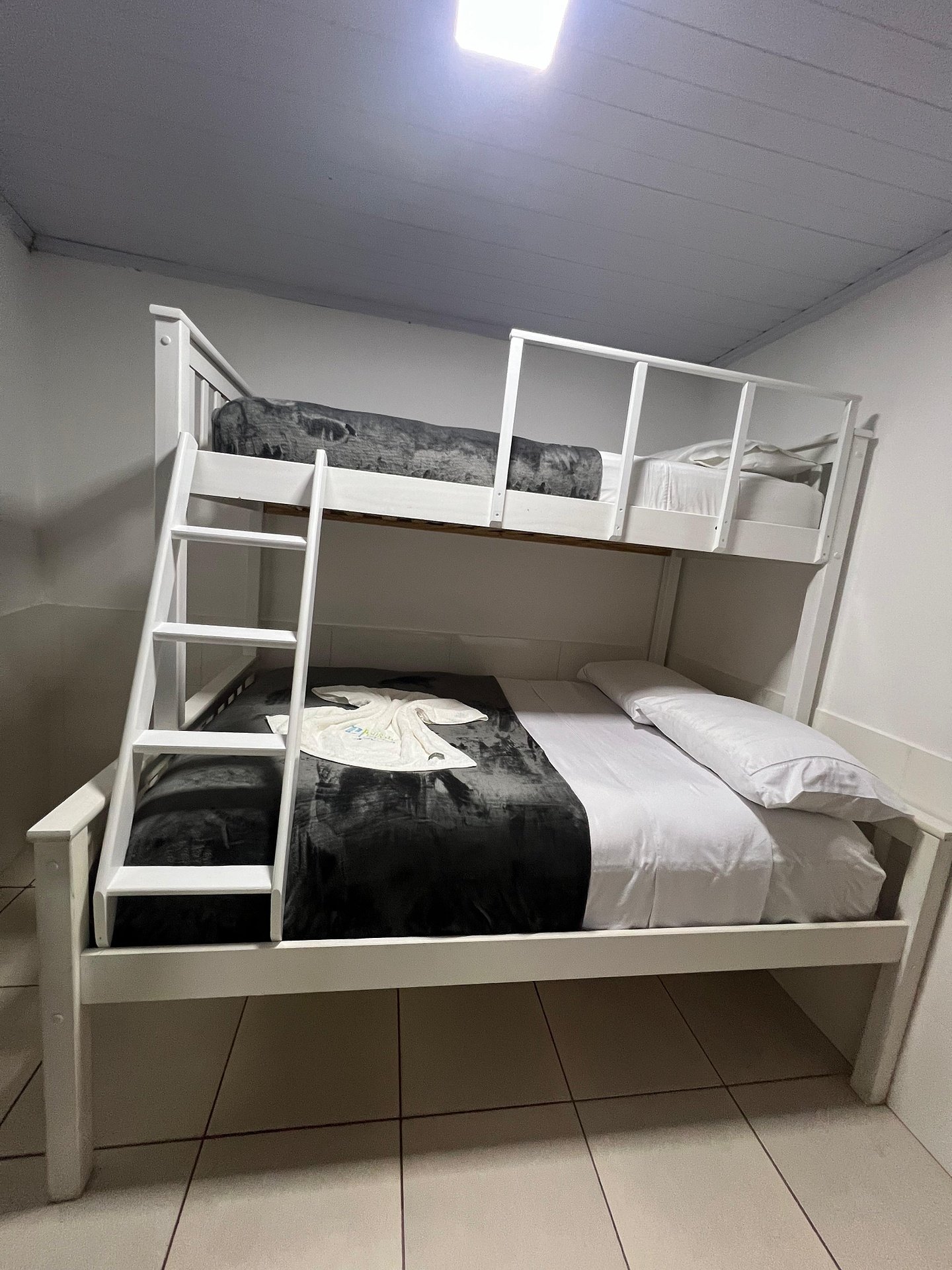 Quartos compartilhados com camas individuais e beliches.